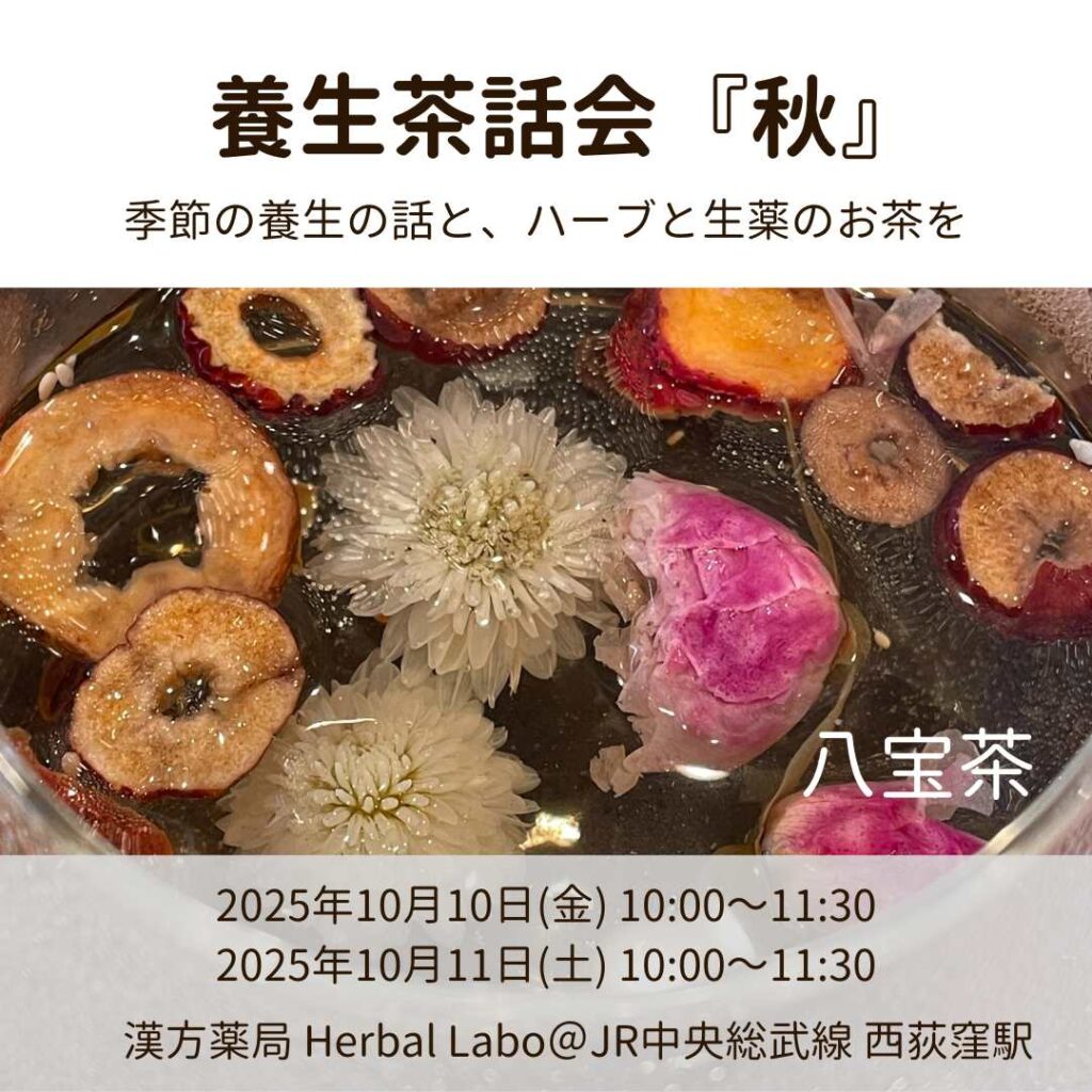 秋に起こりやすい体のトラブルについて、東洋医学や西洋のフィトテラピーの観点から、養生、漢方、取り入れたい精油やハーブなどをご紹介します。また、お茶を飲みながら、皆様がどんな養生を取り入れているか意見交換をしましょう。この回では、秋の乾燥対策にぴったりな中国のお茶「八宝茶」を作り、お持ち帰り頂きます。