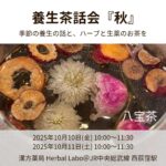 2025-09-18 / 最終更新日時 : 2025-09-28 herbal labo 01.お知らせ 【募集】10/11、10/12養生茶話会『秋』告知 秋の雰囲気が出てきて、空気がカラッとしてきたので、そろそろ秋の養生を意識したい季節。 秋をちょっとでも快適に乗り切る知恵を学びませんか? 秋のお茶として紹介したいのは、「八宝茶」。 フルーツやお花などの様々なお茶の素材を […]