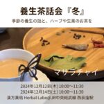 2024-10-26 / 最終更新日時 : 2025-01-03 herbal labo 01.お知らせ 【募集】12/12(木)、12/14(土)養生茶話会『冬』 どんどん寒くなり、冷えから来るトラブルが気になる季節がきました。 スパイスの効いたマサラチャイを飲みながら、冬の養生を学び、話し合う会を開催します。 また、ワークショップ形式で、マサラチャイの素をみんなで作り、お持ち帰り […]